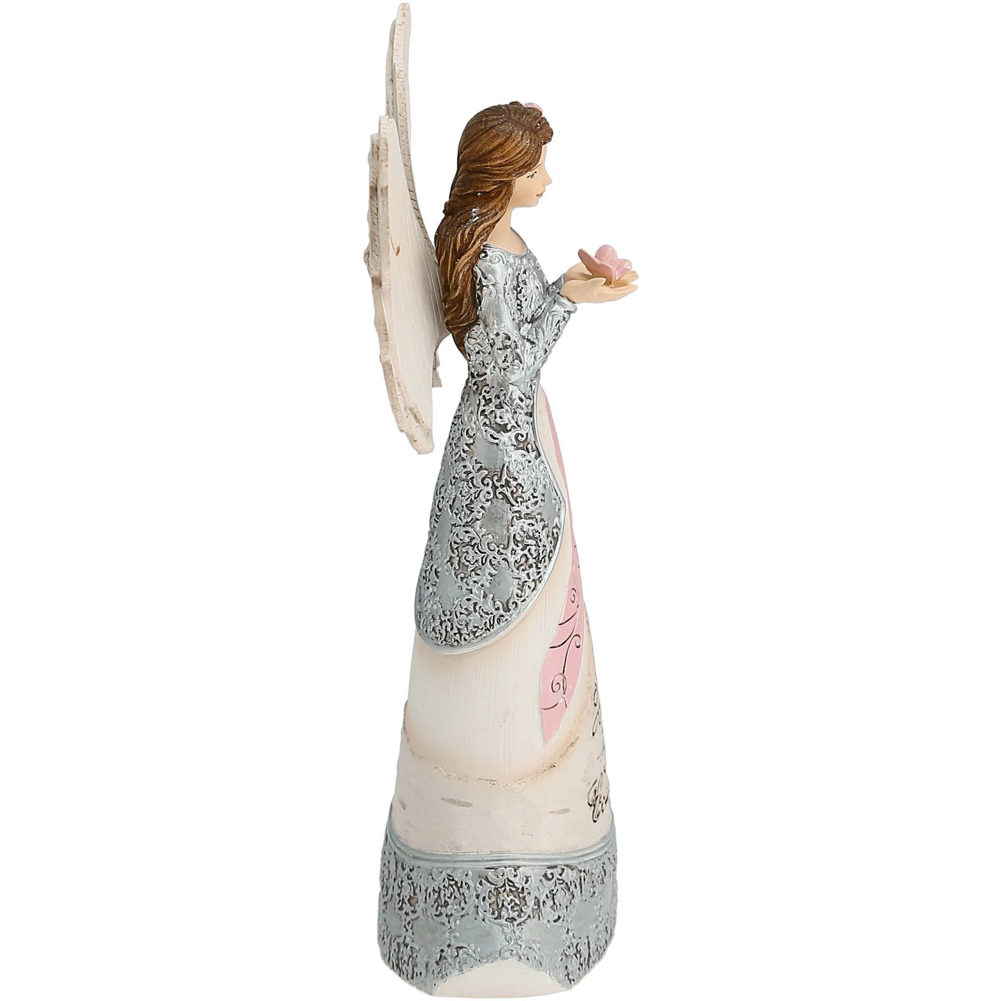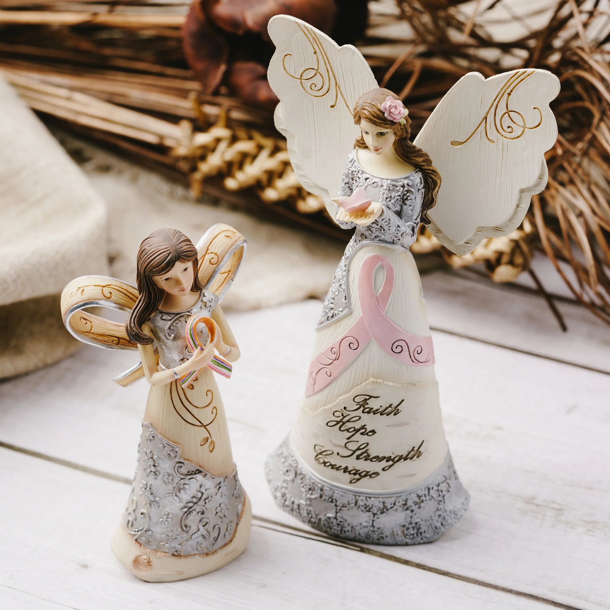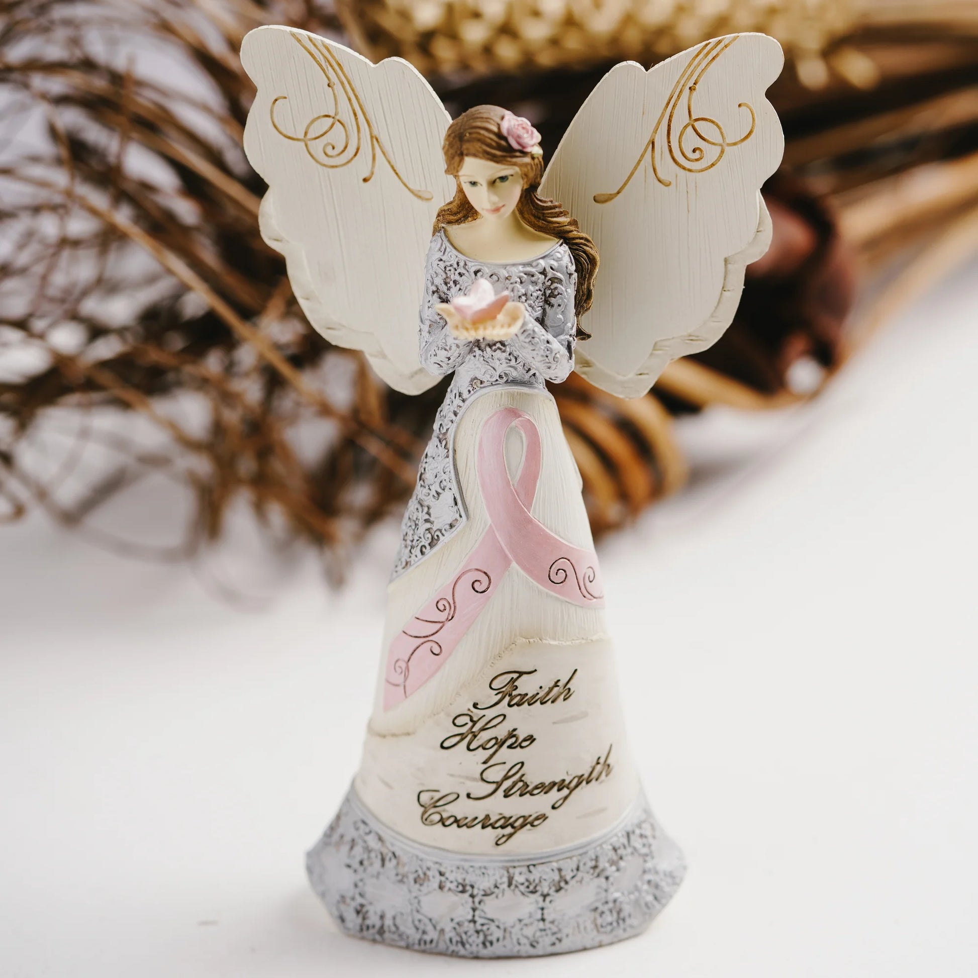 - IN-HOUSE DESIGN: This beautiful brown haired angel is holding a pretty pink butterfly in her hands as a sign of change, hope and life. The matching pink rose in her hair compliments the pink ribbon of healing on the front of her dress. "Faith Hope Strength Courage" text and pink ribbon are both debossed and painted onto the front of the angel, alongside an intricate silver design. There are foam pads on the bottom to prevent surfaces from being scratched.