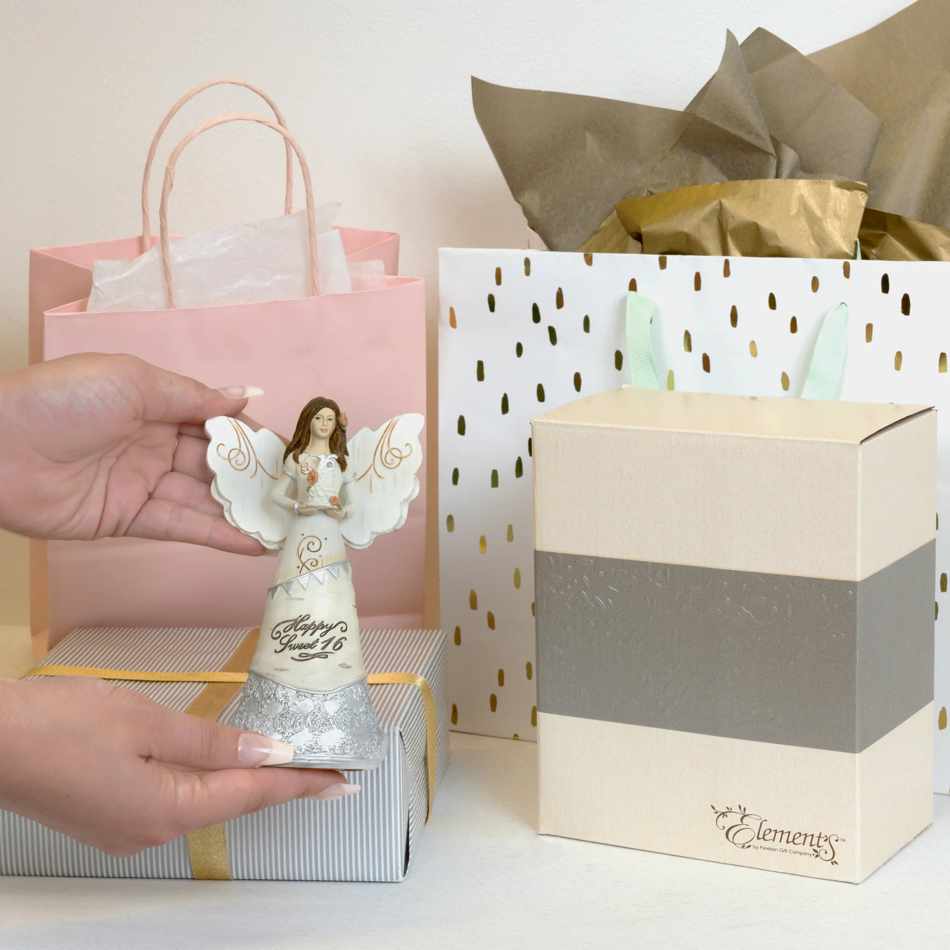 - IN-HOUSE DESIGN: "Happy Sweet 16" text is debossed and painted onto the front of the angel, alongside an intricate silver design and cake. Felt pads on the bottom on the piece reduce the chance of scratching surfaces.