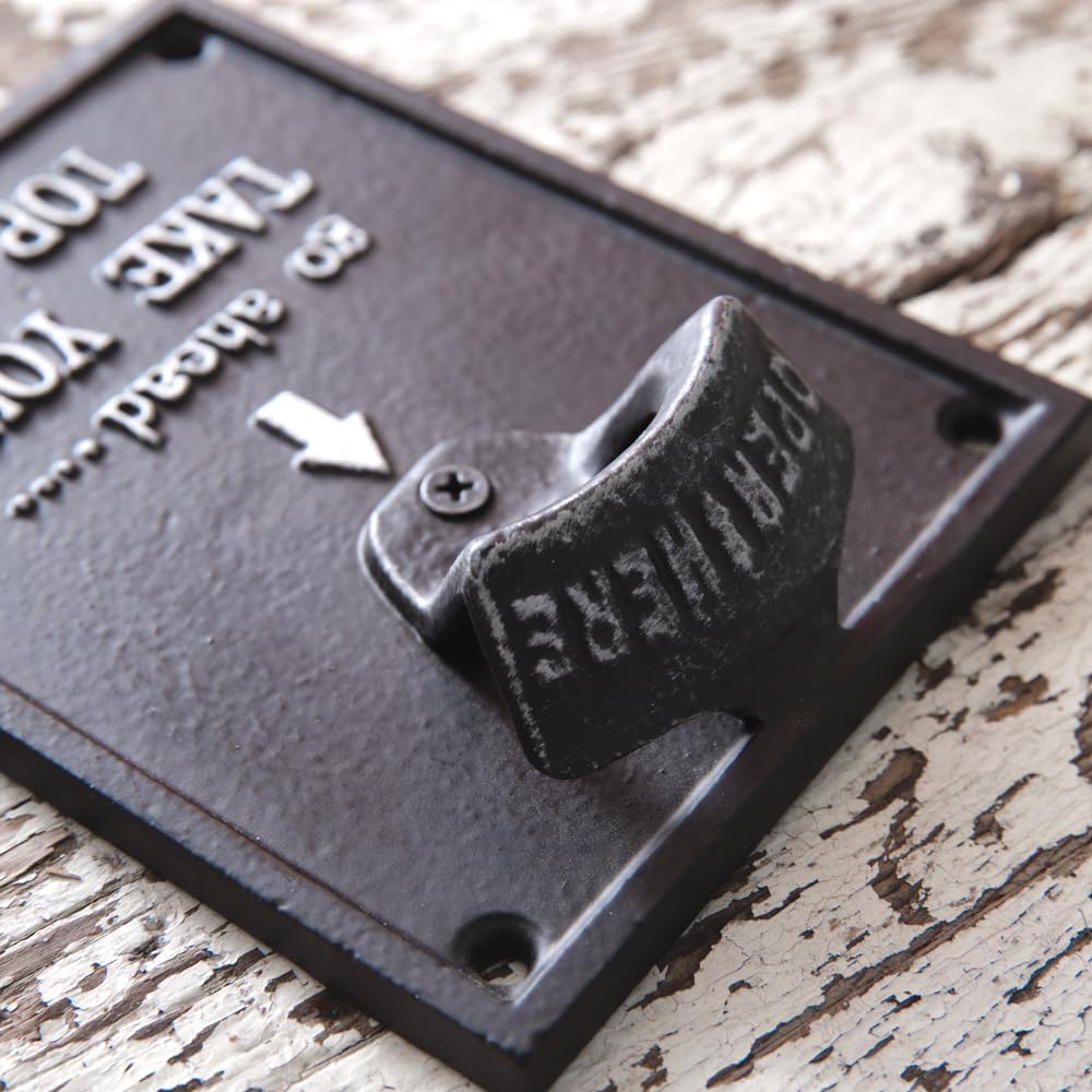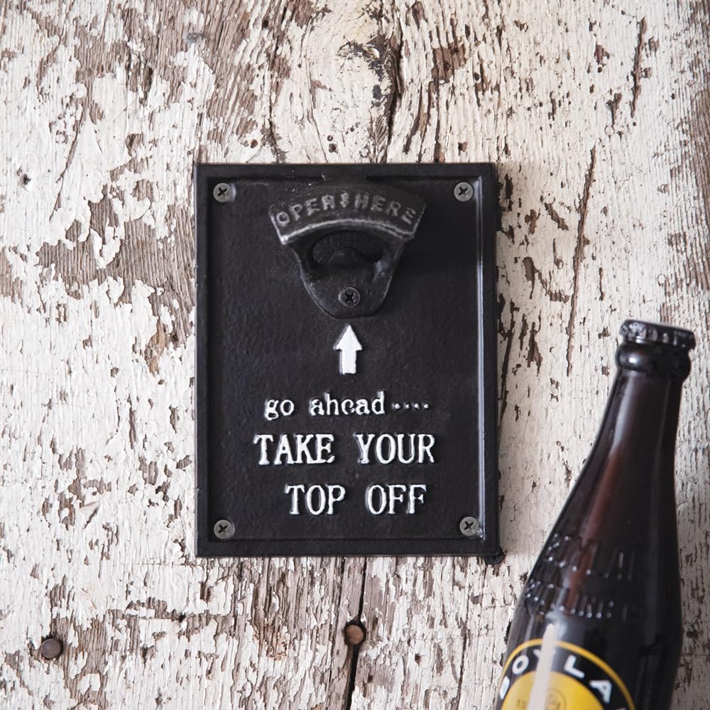 - Take your top off - the bottle of course! This bottle opener sign has a comical take on words.