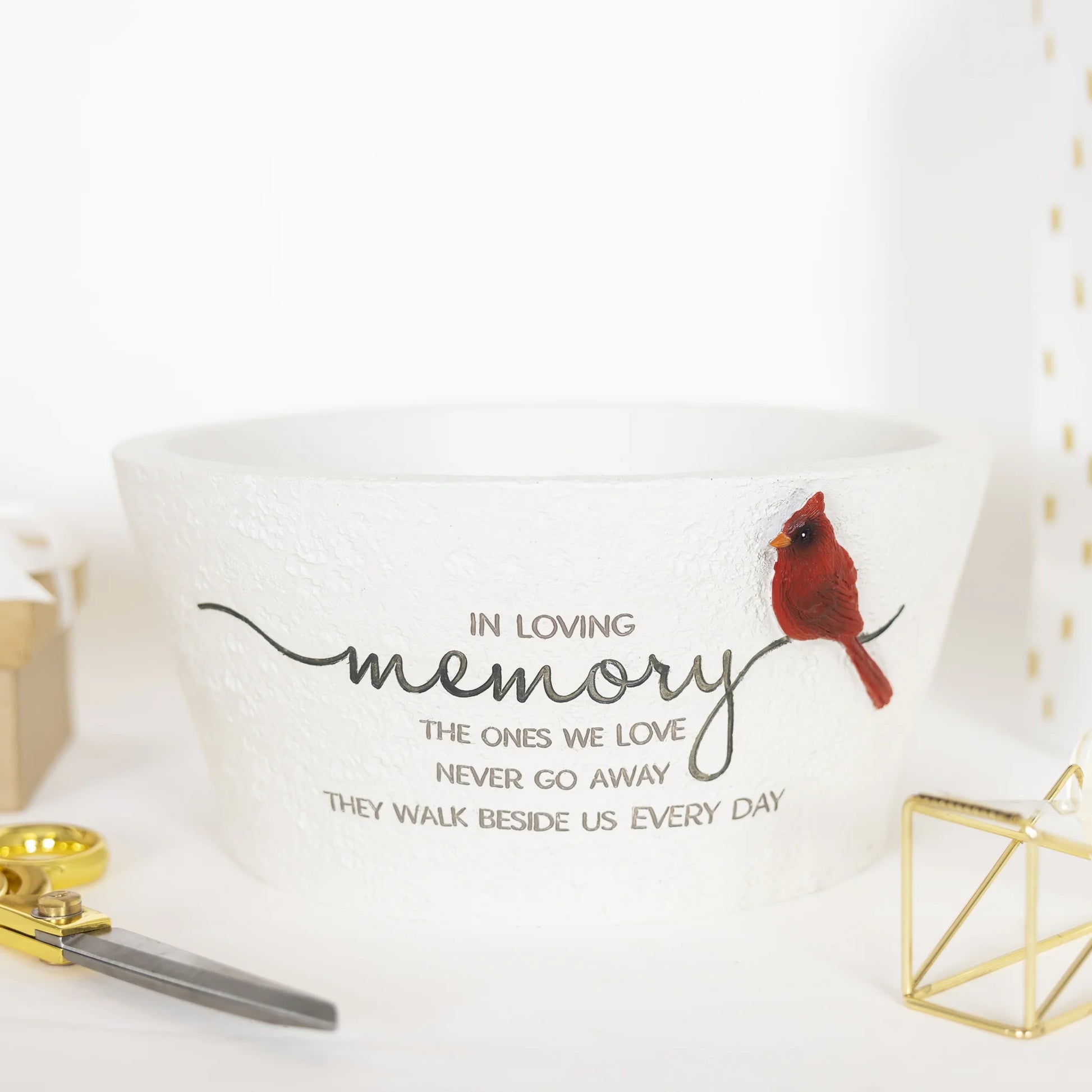 - IN-HOUSE DESIGN: The frontside of our 9.5" long and 4.5" tall resin memorial planter features a heartfelt sentiment debossed in dark gray: "In Loving Memory: The Ones We Love Never Go Away They Walk Beside Us Every Day." Adding a touch of symbolism and beauty, a beautiful handpainted red cardinal is embossed on the branch of the "y", with intricate details and shadowing. The cardinal is often seen as a spiritual messenger, symbolizing a connection to loved ones in heaven, making this planter a meaningful and comforting tribute.