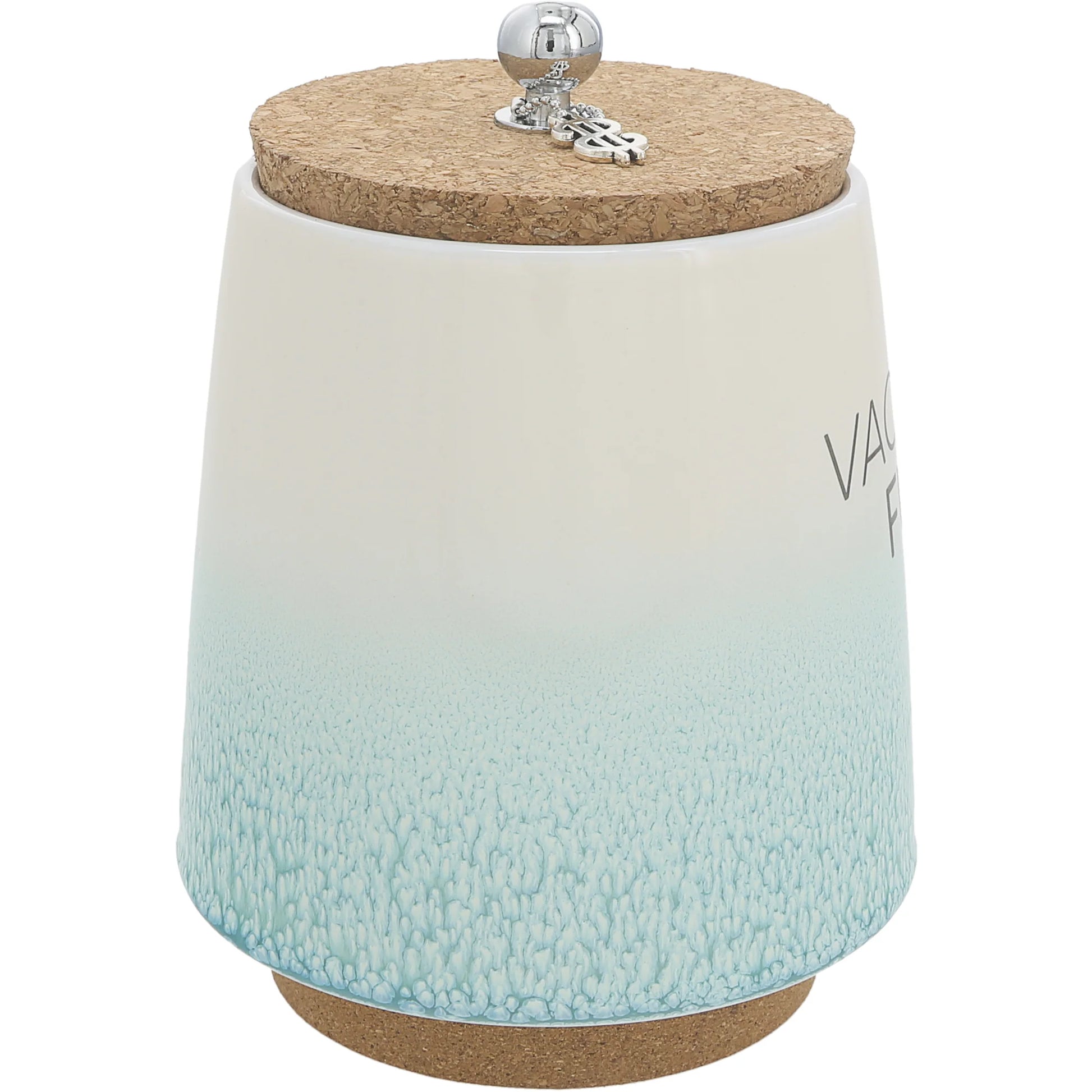 - PREMIUM QUALITY: This incredible money-holding jar is 6.5" tall. The base of the stoneware vessel is 4.5" wide, tapering to 3.5" wide towards the top, where the cork lid narrows from top to bottom to fit snuggly inside the lip of the container. A 1.75" length metal chain holds a removable $ icon keychain that can be added to your keys or left connected to the .5" wide x .75" tall rounded metal ball handle. The base is made from cork to prevent surfaces from scratching and provides an easier grip to pick up the canister.