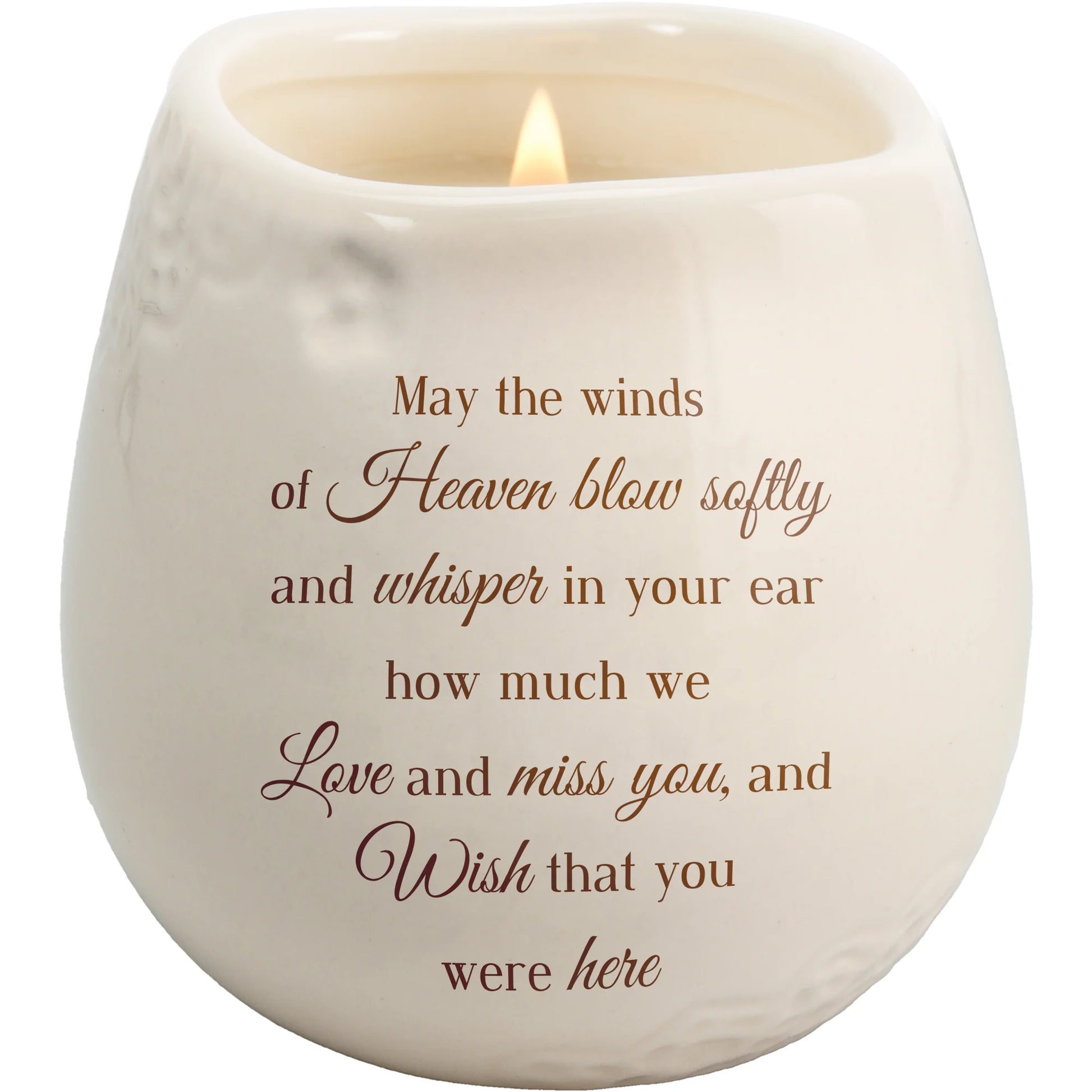 - IN-HOUSE DESIGN: "May the winds of heaven blow softly and whisper in your ear how much we love and miss you, and wish that you were here" text is printed onto the front of the candle holder.